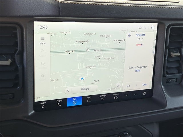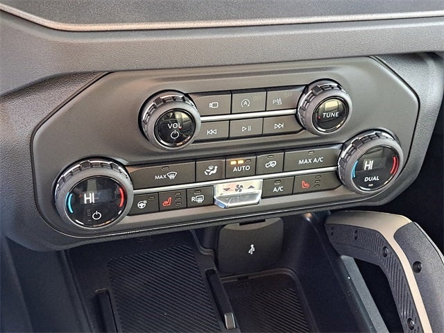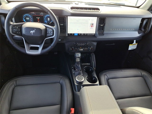 2-Door Intelligent Access w/Lock/Unlock, 360-Degree Camera, 4-Wheel Disc Brakes, 4.7 Axle Ratio, 7 Speakers, ABS brakes, Adaptive Cruise Control, Air Conditioning, Alloy wheels, AM/FM radio: SiriusXM with 360L, AM/FM Stereo, Ambient Footwell Lighting, Auto High-Beam Headlamps, Auto High-beam Headlights, Auto-dimming Rear-View mirror, BLIS Blind Spot Information System, Brake assist, Carbonized Gray Molded-In-Color Hard Top, Compass, Connected Navigation, Delay-off headlights, Door Storage Bags, Dr & Pass Illuminated Sliding Visor Vanity Mirrors, Driver door bin, Driver vanity mirror, Dual front impact airbags, Dual front side impact airbags, Dual Smart Charging USB Ports, Dual-Zone Electronic Automatic Temperature Control, Electronic Stability Control, Emergency communication system: 911 Assist, Equipment Group 334A Lux Package, Evasive Steering Assist, Exterior Parking Camera Rear, Front anti-roll bar, Front Bucket Seats, Front Center Armrest, Front fog lights, Front Parking Sensors, Front reading lights, Front Row Heated Seats, Front wheel independent suspension, Fully automatic headlights, Heated door mirrors, Heated front seats, Heated steering wheel, Illuminated entry, Information on Demand Panel, Integrated roll-over protection, Internet access capable: FordPass Connect, Lane-Keeping System, Leather Shift Knob, Leather-Trimmed/Vinyl Bucket Seats, Low tire pressure warning, Marine Grade Vinyl Heated Bucket Seats, Occupant sensing airbag, Outside temperature display, Overhead airbag, Overhead console, Panic alarm, Passenger door bin, Passenger vanity mirror, Power door mirrors, Power Outlet - Back Side of Center Floor Console, Power steering, Power windows, Pre-Collision Assist w/Automatic Emergency Braking, Radio data system, Radio: B&O Sound System by Bang & Olufsen, Raptor-Style Running Board, Rear Parking Sensors, Rear-View Camera, Rear-Window Defroster & Washer, Remote keyless entry, Security system, Sideview Mirrors, SiriusXM w/360L, Speed control, Split folding rear seat, Steering wheel mounted audio controls, SYNC 4, Tachometer, Telescoping steering wheel, Tilt steering wheel, Traction control, Trip computer, Universal Garage Door Opener, Variably intermittent wipers, Voltmeter, Wheels: 17 Carbonized Gray-Painted Aluminum.
