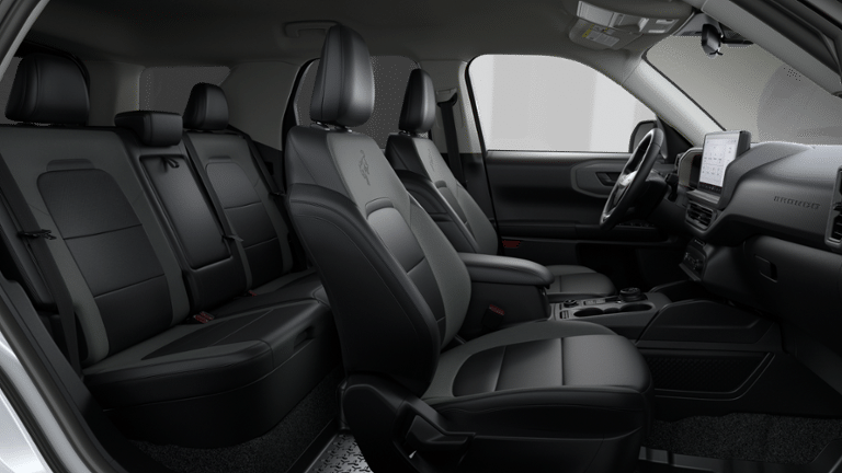 4-Wheel Disc Brakes, 6 Speakers, ABS brakes, Air Conditioning, Alloy wheels, AM/FM radio: SiriusXM with 360L, AM/FM Stereo, Apple CarPlay/Android Auto, Auto High-beam Headlights, Automatic temperature control, Black Appearance Package, Brake assist, Carbon Black Grille with Black Painted BRONCO Lettering, Cargo Mat, Cloth with Easy-to-Clean Front Bucket Seats, Compass, Convenience Package, Delay-off headlights, Driver door bin, Driver vanity mirror, Dual front impact airbags, Dual front side impact airbags, Electronic Stability Control, Emergency communication system: SYNC 4 911 Assist, Equipment Group 200A Standard Package, Exterior Parking Camera Rear, Ford Connectivity Package (1-Year Included), Four wheel independent suspension, Front and Rear Floor Liners Without Carpet Mats, Front anti-roll bar, Front Bucket Seats, Front Center Armrest, Front Driver/Passenger Seat Back Map Pockets, Front reading lights, Fully automatic headlights, Heated 8-Way Power Driver's Seat, Heated door mirrors, Illuminated entry, Internet access capable: 5G Modem - Ford Connectivity Package, Knee airbag, LED Fog Lamps, Liftgate with Black BRONCO SPORT Lettering, Low tire pressure warning, Occupant sensing airbag, Outside temperature display, Overhead airbag, Overhead console, Painted Shadow Black Roof, Panic alarm, Passenger door bin, Passenger vanity mirror, Power door mirrors, Power steering, Power windows, Premium Trimmed Front Sport Contour Bucket Seats, Premium Wrapped Steering Wheel, Radio data system, Rear anti-roll bar, Rear Parking Sensors, Rear reading lights, Rear seat center armrest, Rear window defroster, Rear window wiper, Remote keyless entry, Security system, SiriusXM with 360L, Speed control, Speed-sensing steering, Speed-Sensitive Wipers, Split folding rear seat, Steering wheel mounted audio controls, SYNC 4 with Enhanced Voice Recognition, Tachometer, Telescoping steering wheel, Tilt steering wheel, Traction control, Trip computer, Variably intermittent wipers, Wheels: 17 Carbonized Gray Painted Aluminum, Wheels: 17 Matte Black-Painted Aluminum.